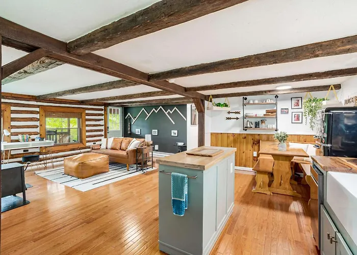 The 3-bedroom Creekside Berkeley Springs Cabin On 35 Acres! Venue is less than within a 15-minute drive of Frog Valley Artisans. This accommodation has a full kitchen provided with amenities, such as a fridge, an oven, and a stovetop for self-catering.