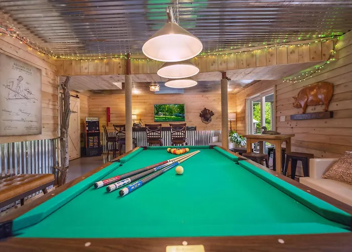 Large Cabin W Hot Tub, Fire Pit, Wifi, & Huge Yard Villa is located 18 minutes' walk from Morgan Arts Council and 15 minutes' walk away from First United Methodist Church. There is a fully furnished kitchen with a refrigerator, an oven, and kitchenware while 2 bathrooms are included as well.